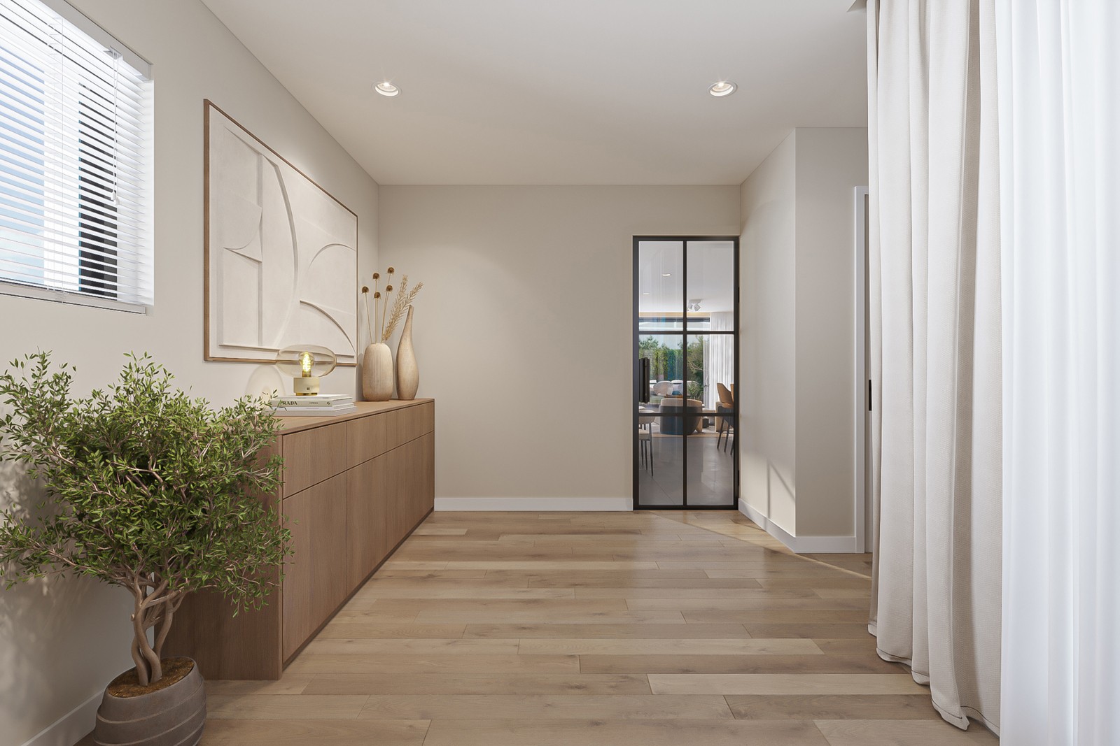 Een elegant uitgerekte inkomhal biedt meteen toegang tot het hart van de woning. Open leefruimte, eetgelegenheid en keuken vormen – samen begeleid door de grote raampartijen – een harmonieus en lichtrijk geheel. Ervaar vooral ook de verbondenheid met de tuin tijdens het koken.
