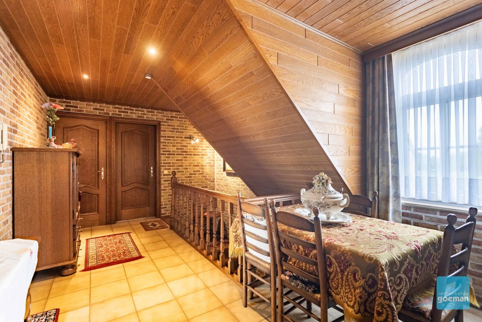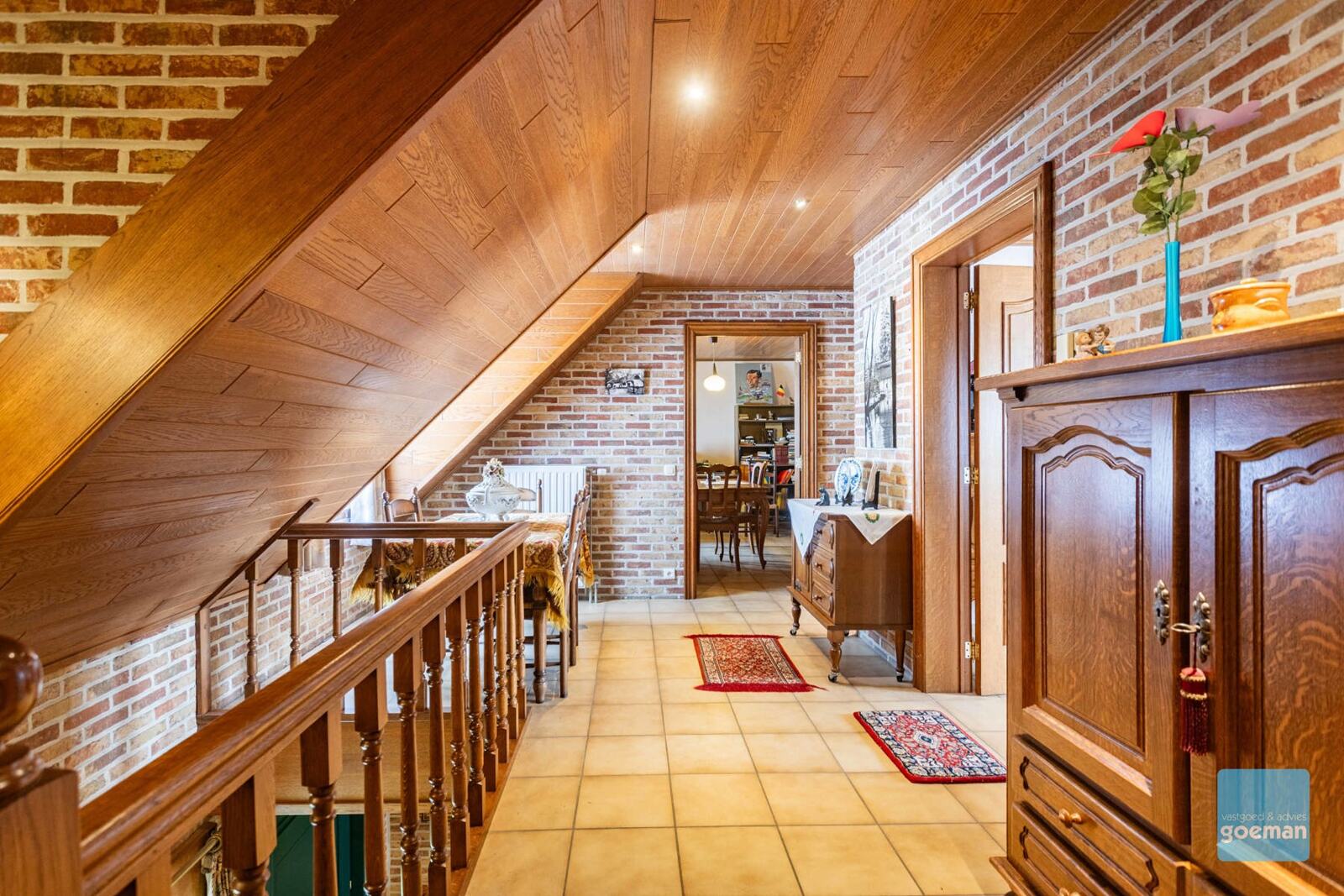 Op de bovenverdieping vind je 2 grote slaapkamers, apart toilet, een nog niet afgewerkte badkamer en een zolderruimte, die mogelijkheid biedt tot 2 extra slaapkamers.