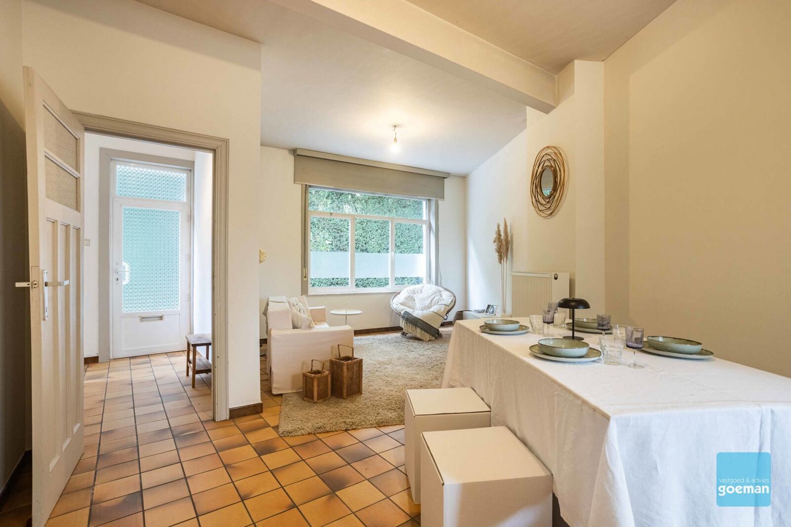 Woning met gezellig tuintje en terras, achteraan bereikbaar via een voetweg achter het perceel. Je hoeft dus nooit door de woning met fiets of vuilnis.